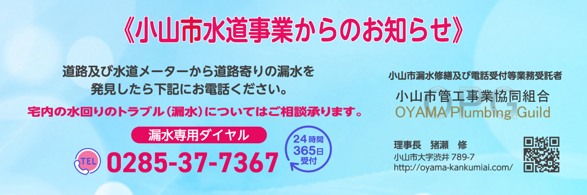 ※「指定水道工事店」は全国の市町村等の各水道局が指定した給水装置工事事業者をいい、国家資格である給水装置工事主任技術者が工事に従事しています。当組合の組合員は、全員が小山市から「指定給水装置工事事業者」「排水設備指定工事店」の指定を受けています。宅地内の給水装置・排水設備は、指定工事業者でなければ工事ができません。